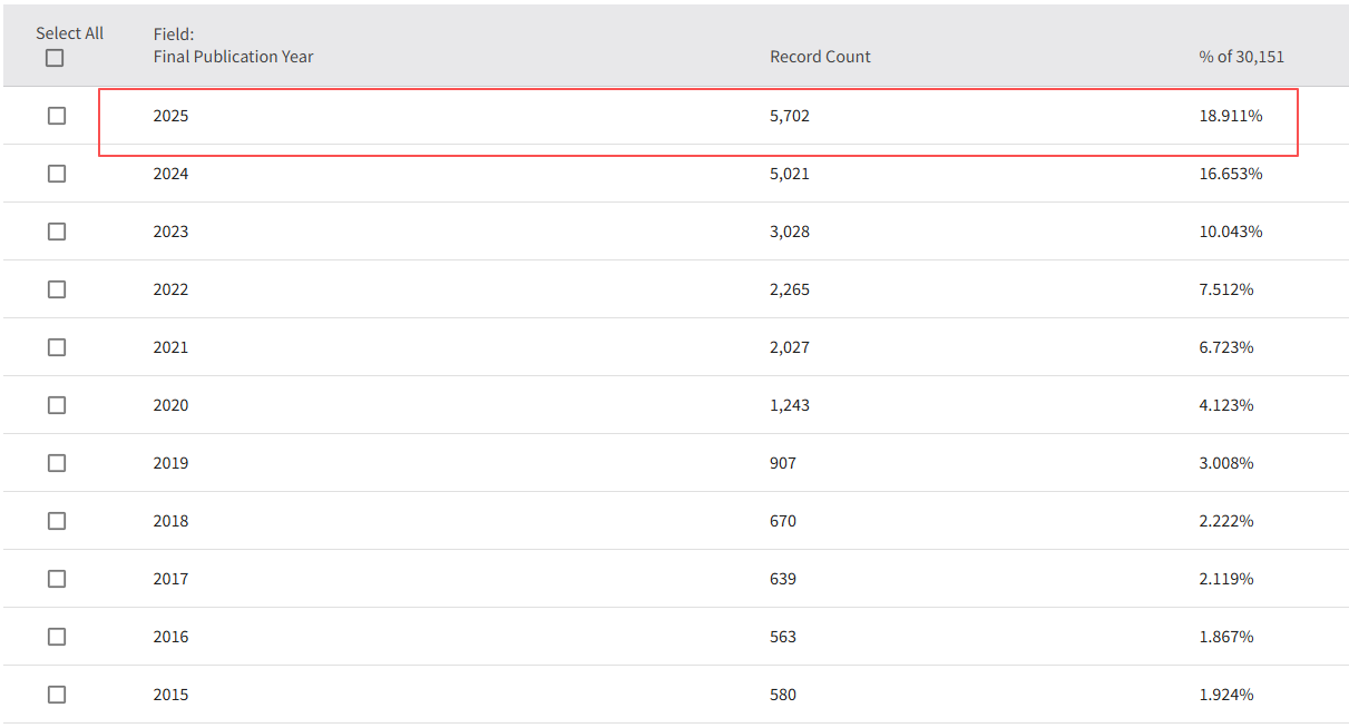 近十年急剧增长,从每年500余篇增至2024年的5021篇,,2024年(5021篇)较2023年发文量上涨超65%,预计2025年将突破6000篇。如此激进的扩刊节奏,再加上期刊长期处于较高的自引率,或将给其长远的学术质量与学术声誉带来不可小觑的潜在风险。