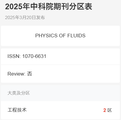 【简介】Physics of Fluids创刊于1994年,专注于发表气体、液体及复杂流体动力学的原创理论、计算与实验研究,涵盖空气动力学、气溶胶、人工智能与流体交互等方向。该刊为月刊,每年出版12期。