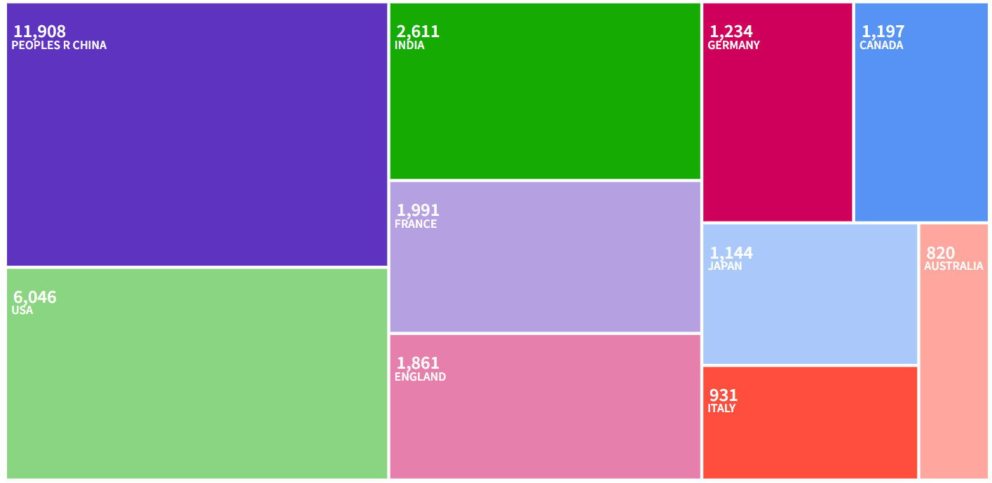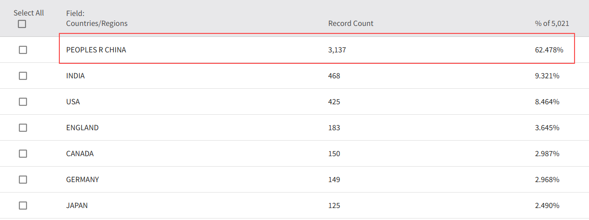 中国学者占主导地位,共计发文11908篇,占比39.495%,且在近三年占比持续上升,2024年达62.478%。美国(6046篇)、印度(2611)分别位列第二、三位。