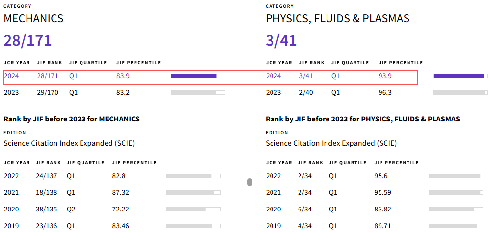 JCR分区:Q1(JIF排名:28/171 力学;3/41 物理学,流体与等离子体)