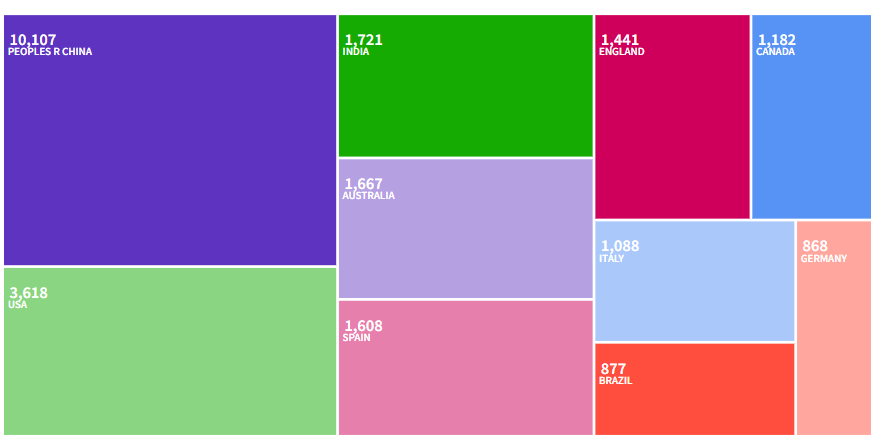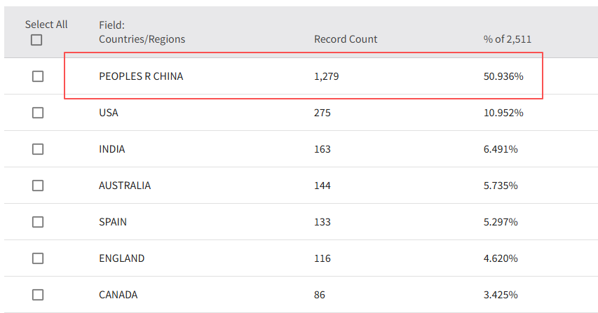 在发文来源中,中国学者占主导地位,共计发文10107篇,排名第一;其次是美国学者,发文3618篇。