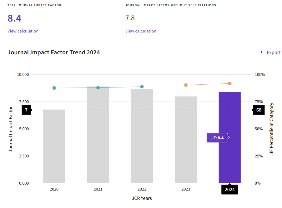 JEM的影响因子长期稳居领域前列,基本维持在8分以上。2021 年跃升至8.91,2023开始有所回落,其最新IF=8.4。此外,结合其CiteScore为14.40来看,JEM具有较高的学术影响力和广泛的国际认可度。