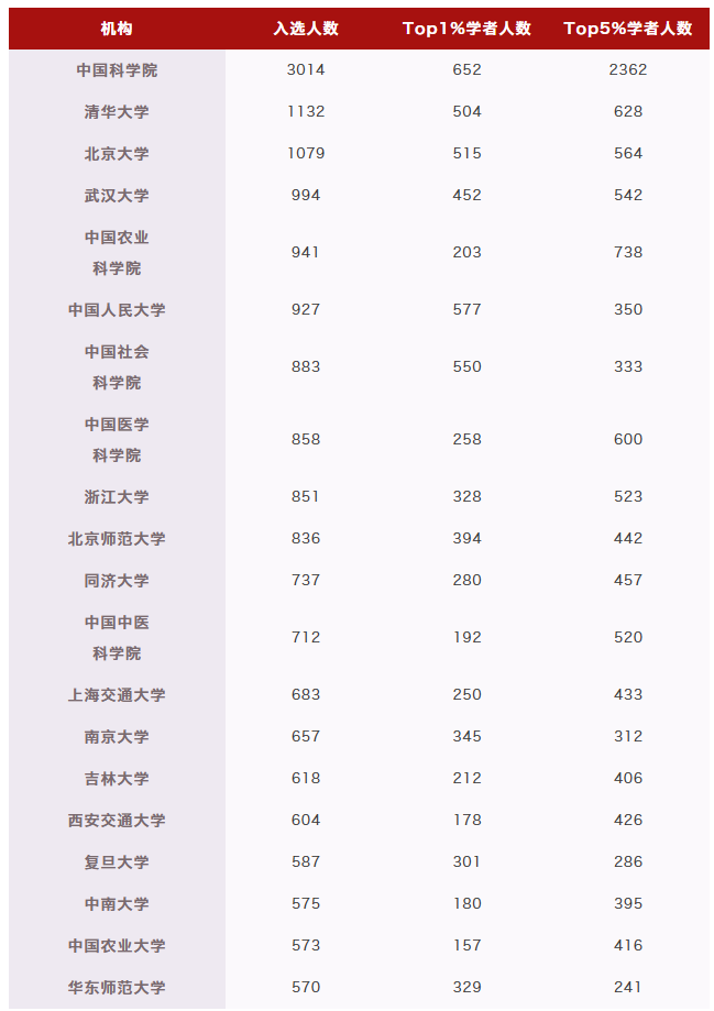 中国科学院、清华大学、北京大学是入选人数最多的3所机构。
