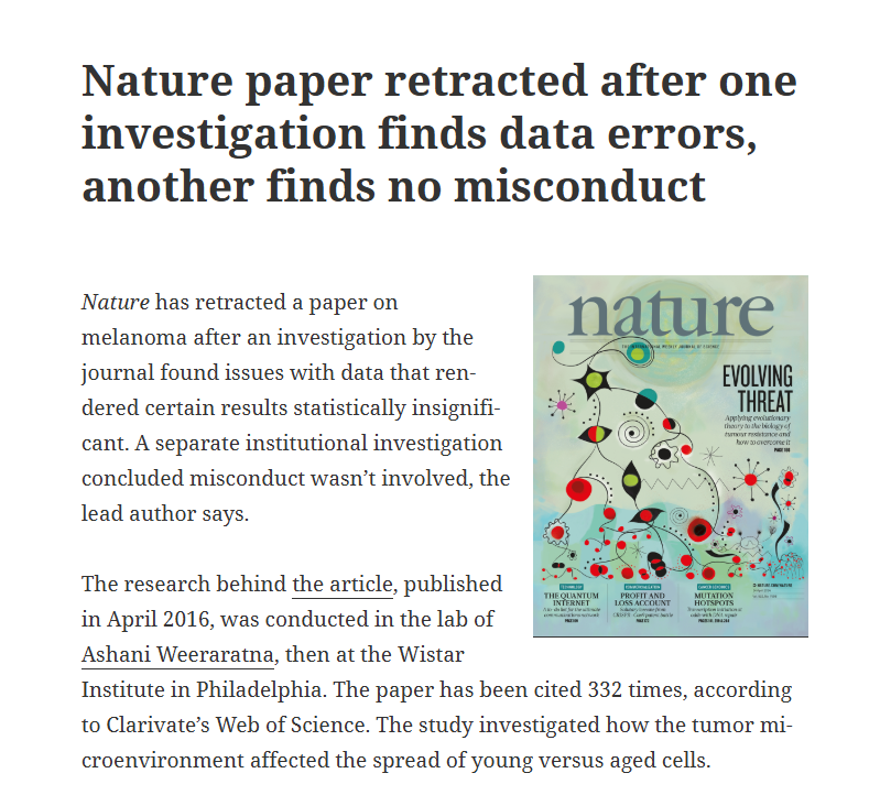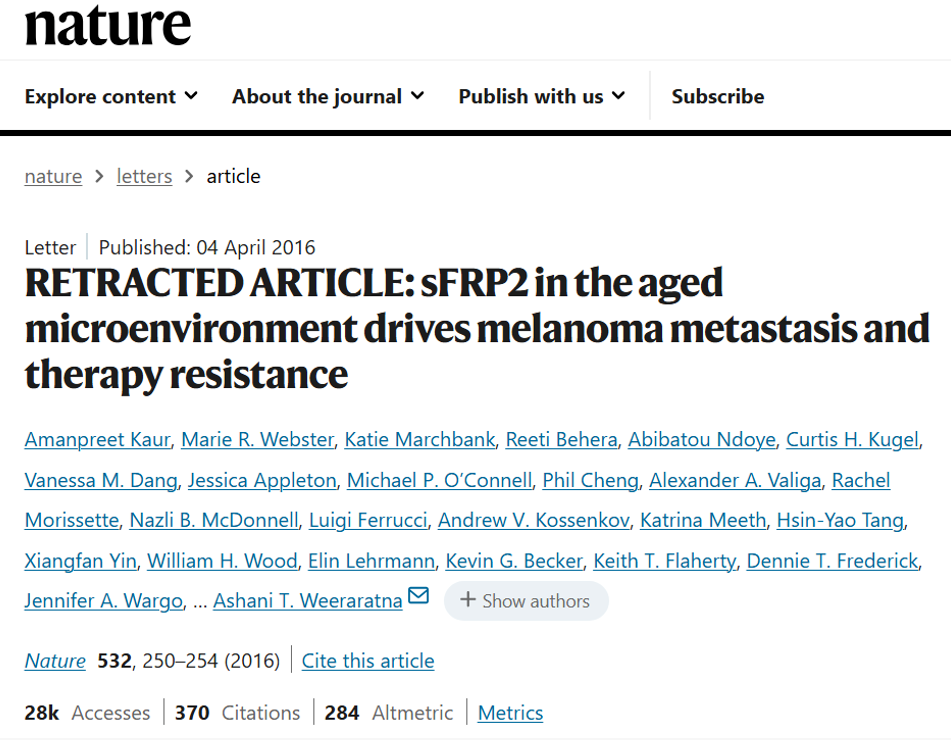 2024年10月,Nature期刊发布撤稿声明:决定撤回其于2016年4月发表的一篇黑色素瘤研究论文。此前调查发现论文数据存在问题,导致部分关键结果失去统计学显著性。但论文第一作者表示,其所在机构的独立调查结论认为“不存在不当行为”。
