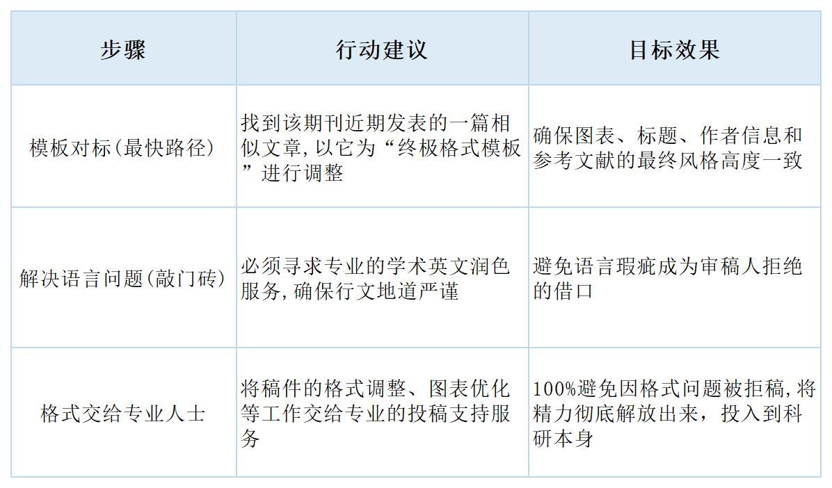 与其在格式上冒险,不如将时间花在完善您的科学故事上。我们建议采取以下策略,确保您的研究成果能够以最专业的姿态呈现在编辑和审稿人面前: