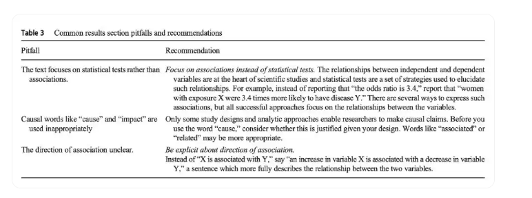 结果部分的常见错误和建议见下图。常见错误包括:文本内容侧重于统计检验而忽视了相关性;不恰当地使用诸如“造成(cause)”和“影响(impact)”之类带有因果属性的词;相关性的方向不明(正相关or负相关)。