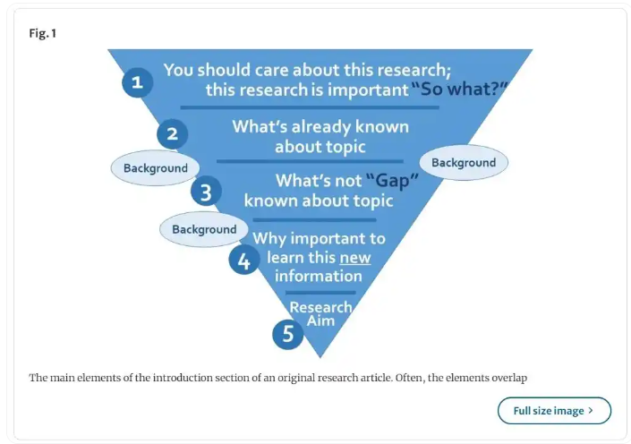 从总体背景开始,逐渐缩小到论文的具体重点。包括五大要素:该主题的研究为什么很重要,关于该主题已知哪些信息,该主题有哪些未知内容(差距),为什么添加这些新信息非常重要,本研究的具体研究目标。
