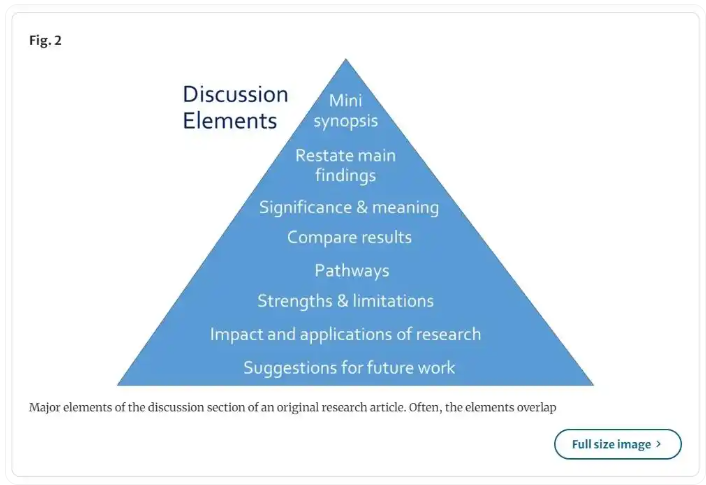 与引言部分相反,讨论部分应采用正三角形的形式,从对结果的解释开始,然后转向更广泛的领域。本节内容通常以重新叙述主要发现开始,可以使用一些精心打磨过的句子。接下来解释结果的意义,将读者的目光从研究的具体发现转移到更广泛的应用上。