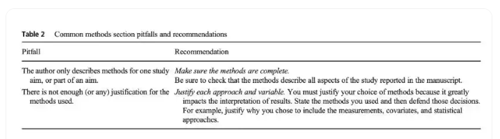 方法部分的常见错误和建议见下图。常见错误包括:只描述了某一个研究目标或部分目标的方法学;所使用的统计方法没有足够或充分的理由。相关建议包括:确保方法学部分完整;阐明使用的方法学和纳入变量的合理性。