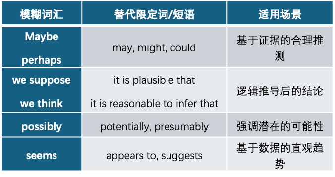 在学术写作中,"maybe""we suppose"等词汇的核心问题的是缺乏学术严谨性,具体体现在三个方面:
