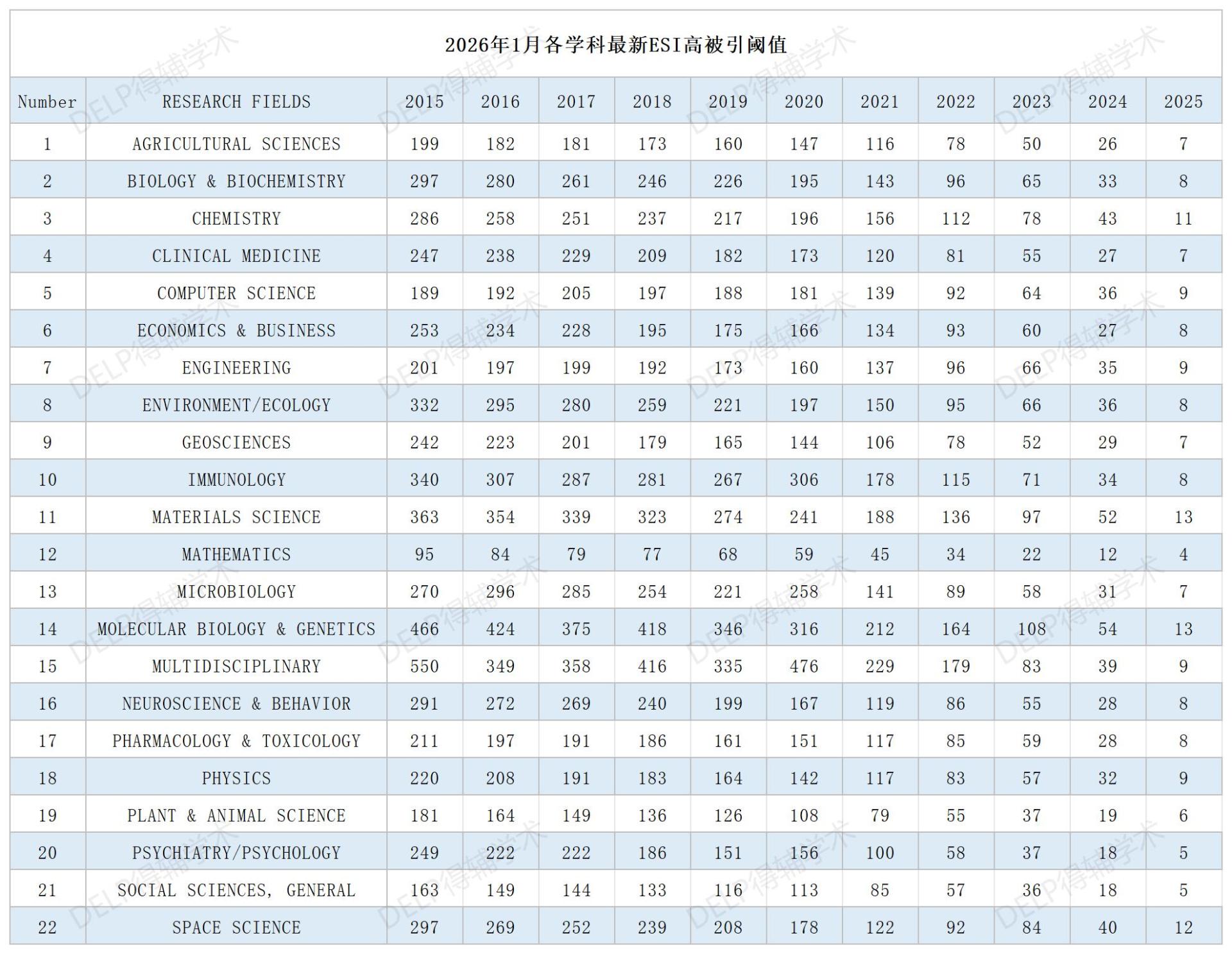 高被引论文是与同学科、同年论文进行比较的结果。ESI高被引论文阈值表提供22个学科(Research Fields),不同年份论文被引频次阈值(threshold)。