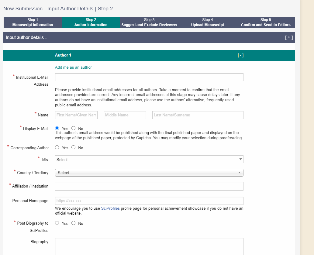 对于使用MDPI的投稿系统作者而言,首先需要注册账号,完善作者信息。