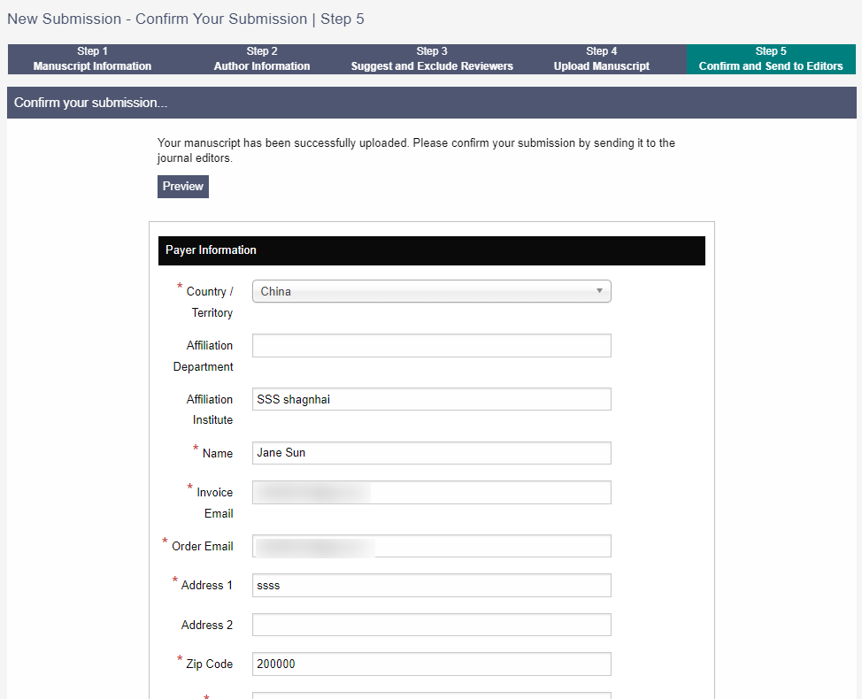 在此步骤中,稿件将正式提交给期刊。同时,您可以了解或使用可能获得的文章处理费用折扣。