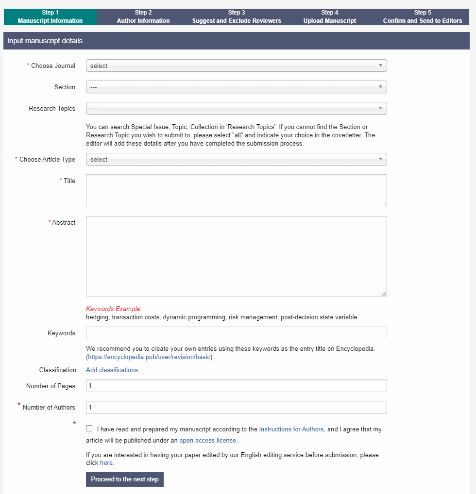 进入上传稿件后的第一个页面,需要根据稿件的主题选择所投稿的期刊栏目 (Section)。同时,您也可以在该页面中选择投稿到期刊的Special Issue、Topics 或 Topical Collection。