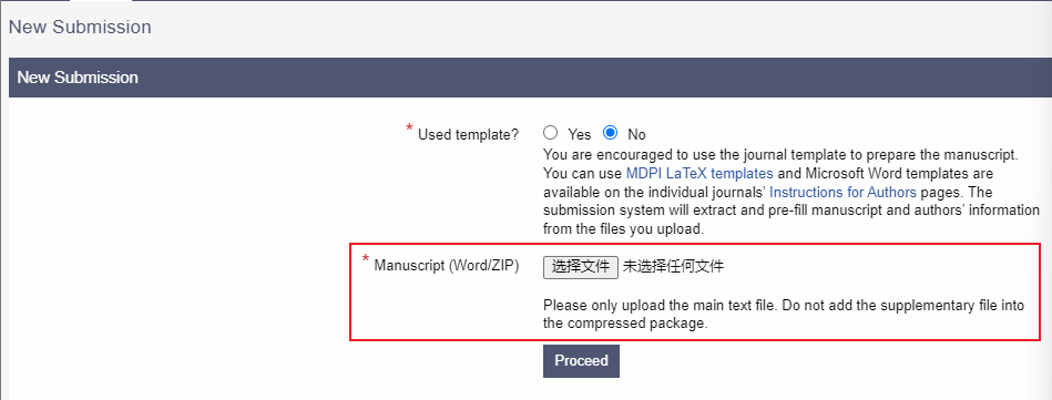 点击提交稿件按钮后,需要在此页面中选择“是否使用了稿件模板”,并上传稿件。上传前,请确保稿件已经过仔细检查,语句通顺。不小心上传错了文件也不用担心,点击下方的 “Clear” 就可以删除了,重新选择就好。确认无误后,点击 “Proceed” 进入下一步。