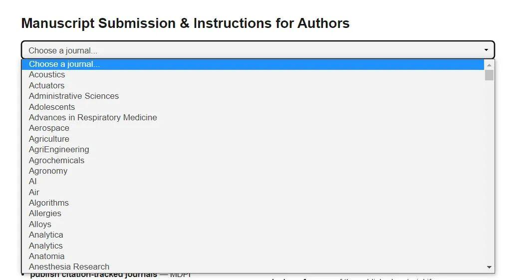 您还可以通过 MDPI 作者页面 中的下拉列表查看 MDPI 的所有期刊及其主题 (Aims and Scope),从而选择适合的期刊进行投稿。