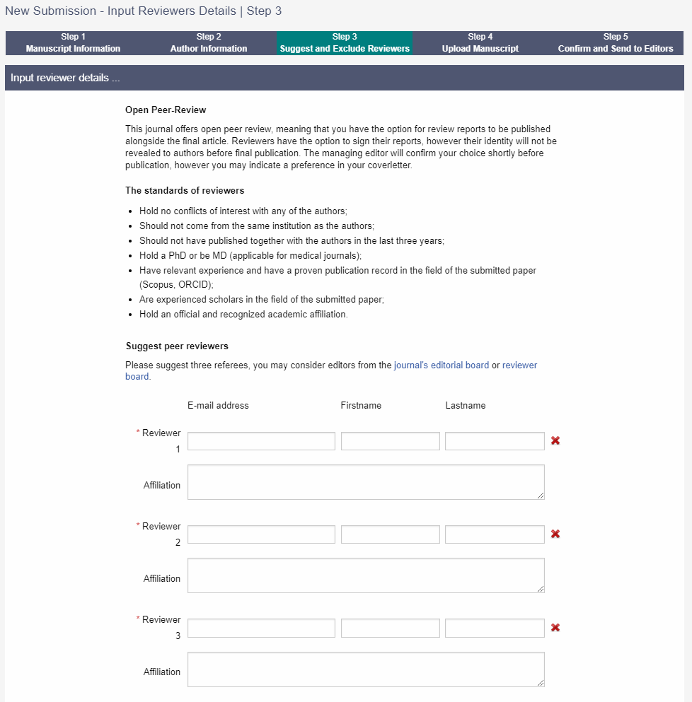 期刊要求推荐至少 3 位审稿人,需要给出邮箱,姓名和单位。在选择审稿人时,请注意不要选择在过去3年内与任何一位作者合作过的学者,以确保评审意见的公正,及最终所发表论文的质量。