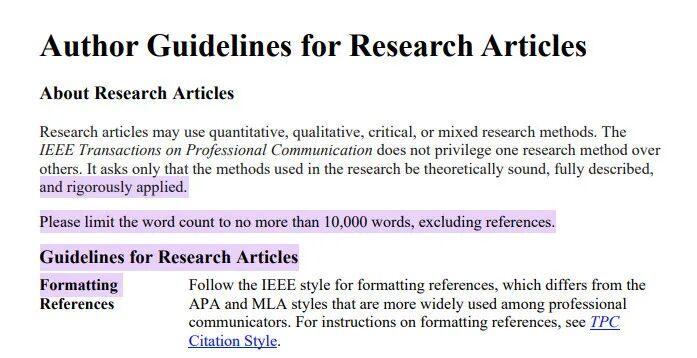 IEEE Transactions系列期刊往往采用页数限制或较高的字数上限。例如,IEEE的一些稿约提到正文不超过10000词(不含参考文献);还有不少IEEE期刊以两栏版面页数计算,如限定全文不超8-10页(约相当于6000~8000词),超页需付额外费用等。
