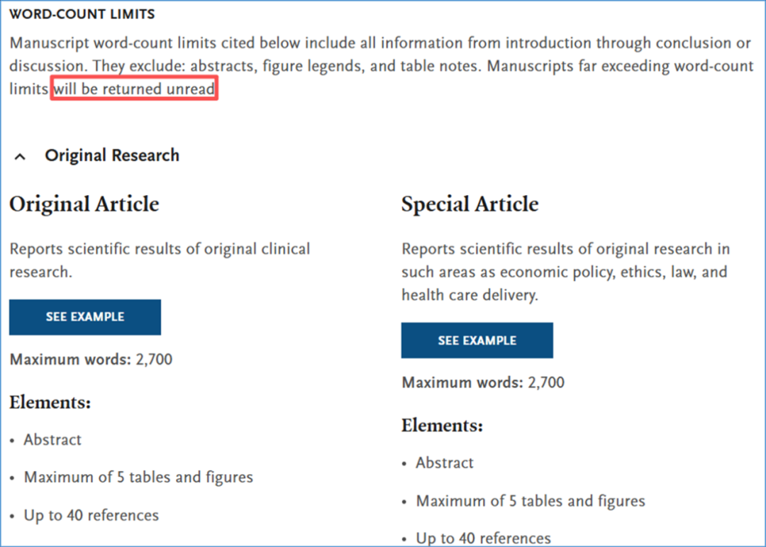 以The New England Journal of Medicine(NEJM)为例,其对各类文章的字数限制极为明确。投稿若明显超标,很可能在送审前就被退回。这并非期刊刻意刁难,而是基于以下原因: