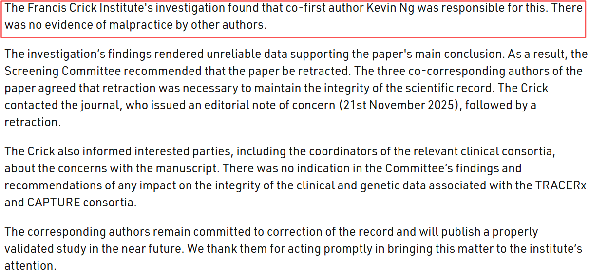 克里克研究所在官方声明中明确表示,调查“未发现其他作者存在不当行为的证据”,并将责任完全归咎于第一作者Kevin Ng(现为洛克菲勒大学博士后)。论文三位通讯作者——George Kassiotis、Charles Swanton和Julian Downward均同意撤稿。