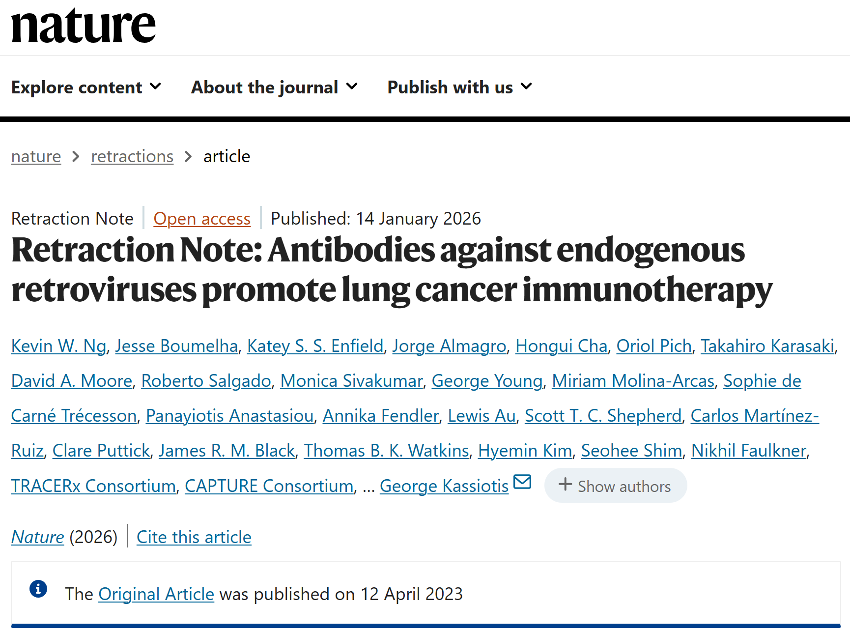 据撤稿观察数据显示,国际顶级期刊《Nature》近日正式撤下一篇于2023年发表的论文。该研究因探讨肺癌免疫疗法敏感性而备受关注。撤稿声明指出,调查证实论文第一作者、时任英国弗朗西斯·克里克研究所博士生的Kevin Ng篡改了多个关键图表的数据。