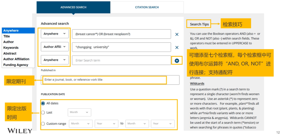 本文以Wiley旗下期刊为例进行说明。使用如Wiley Online Library这类数据库进行检索时,策略通常可从宽泛到精确,分为:学科浏览 → 简单检索 → 高级检索。