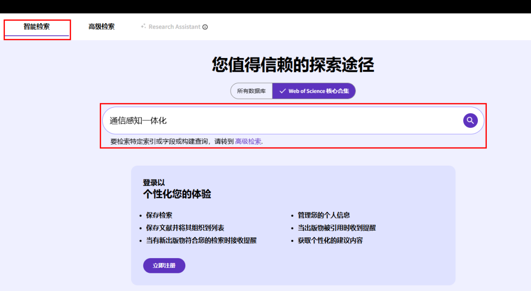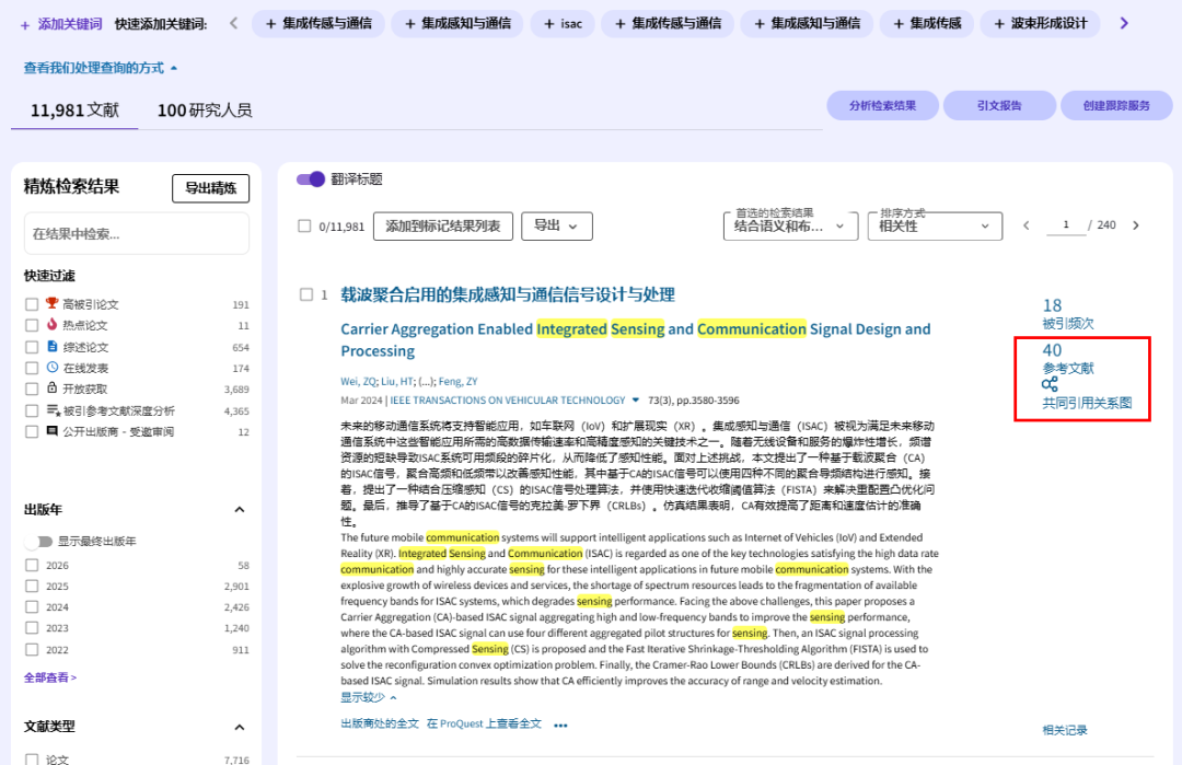 进入其界面后,在检索模块直接输入研究课题的关键词(系统支持中文词检索,例如:“通信感知一体化”),即可查找相关外文文献。通过检索框上方的标签,可限定检索范围为“所有数据库”或“Web of Science核心合集”。