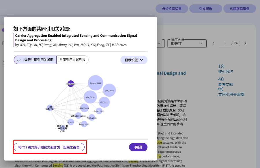 在该图中,可查看与当前论文共同被其他文献引用的论文。共被引次数越多(图中圆圈越大),通常表明其与当前论文的主题相关性越高。利用此功能,可以拓展检索范围,发现更多相关文献。