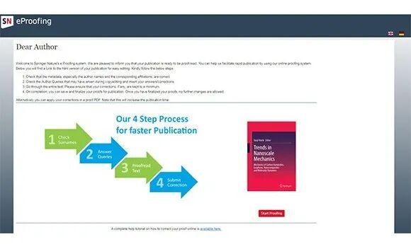 提供在线交互式校样系统(e.Proofing),允许直接修改并记录。强调改动应限于排版与小错误,完成校样后常先在线发表。