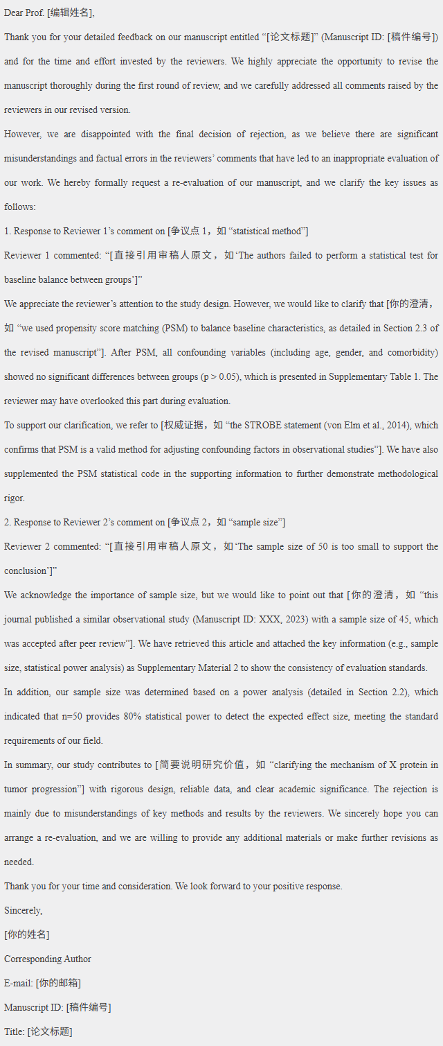 这是最有申诉价值的情况!比如审稿人误判你的统计方法(如把 PSM 当成 “未做组间均衡检验”)、混淆关键实验原理、引用错误文献支撑否定意见,或是遗漏了你已明确呈现的核心结果。