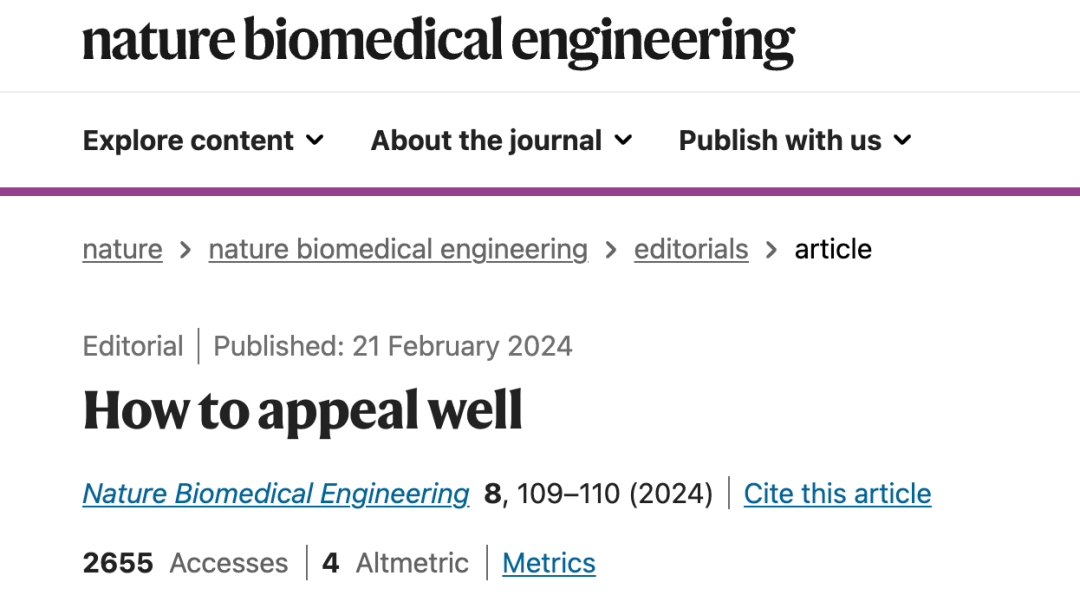 Nature Biomedical Engineering 发表的一篇题为 How to appeal well 的社论中指出,对期刊编辑的负面决定进行appeal时,考虑编辑评估的依据并提出改进的方向,可能会更有成效。