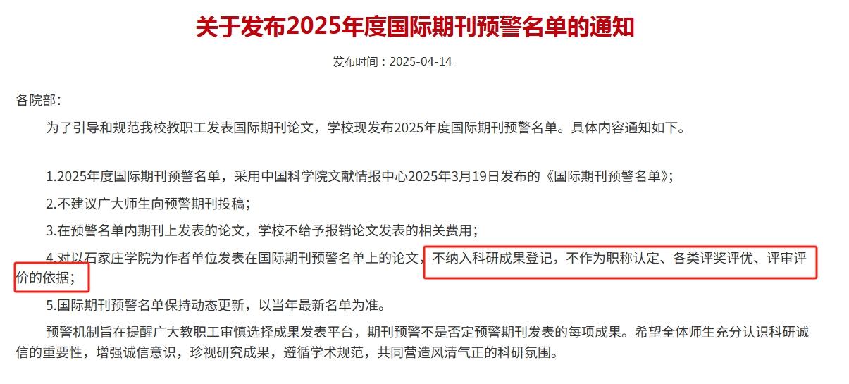 2025年石家庄学院等相关机构都发布了关于预警期刊发表,不纳入科研成果的相关内容。