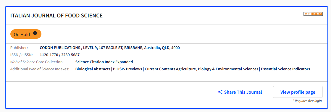 如今科睿唯安对Italian Journal of Food Science采取On Hold的索引策略,即对其质量和出版范围等索引指标持保留意见,也就是将在重新评估后对其做出“剔除”或者是“继续收录”的结论。