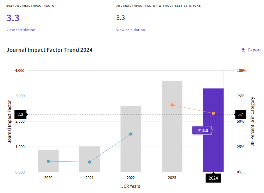 期刊影响因子稳定上涨,2020-2023年从0.9涨至3.6,去年稍有回落,目前期刊最新影响因子为3.3。