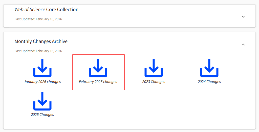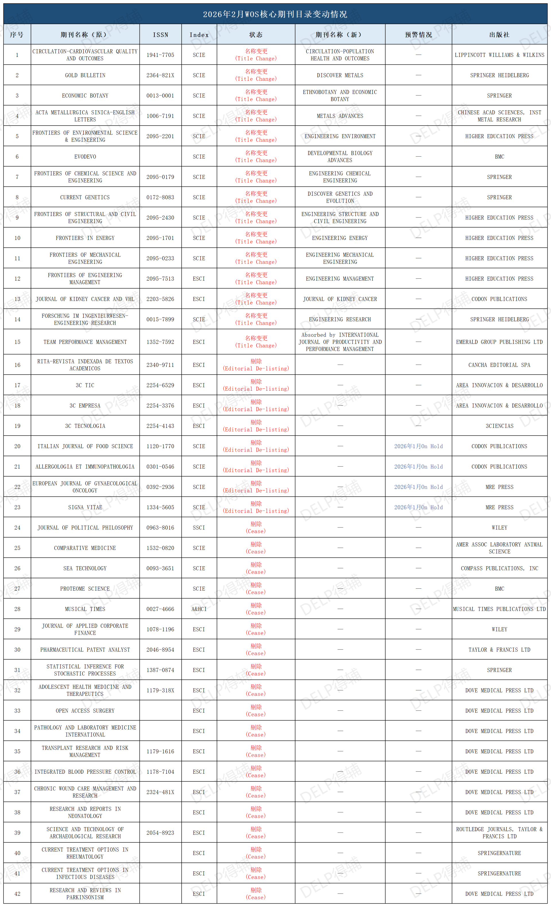 2026年2月16日,Web of Science(WOS)数据库进行了本年度第2次核心期刊目录更新。本次更新涉及42本期刊的变动: